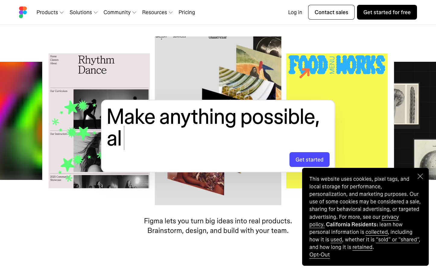 Figma's brand radiates creative empowerment through vibrant, gradient-rich showcases of user work floating on clean white space. The typography balances playful creativity (using varied weights like 330 and 520) with professional precision, while colorful design examples create an energetic, possibility-rich atmosphere.