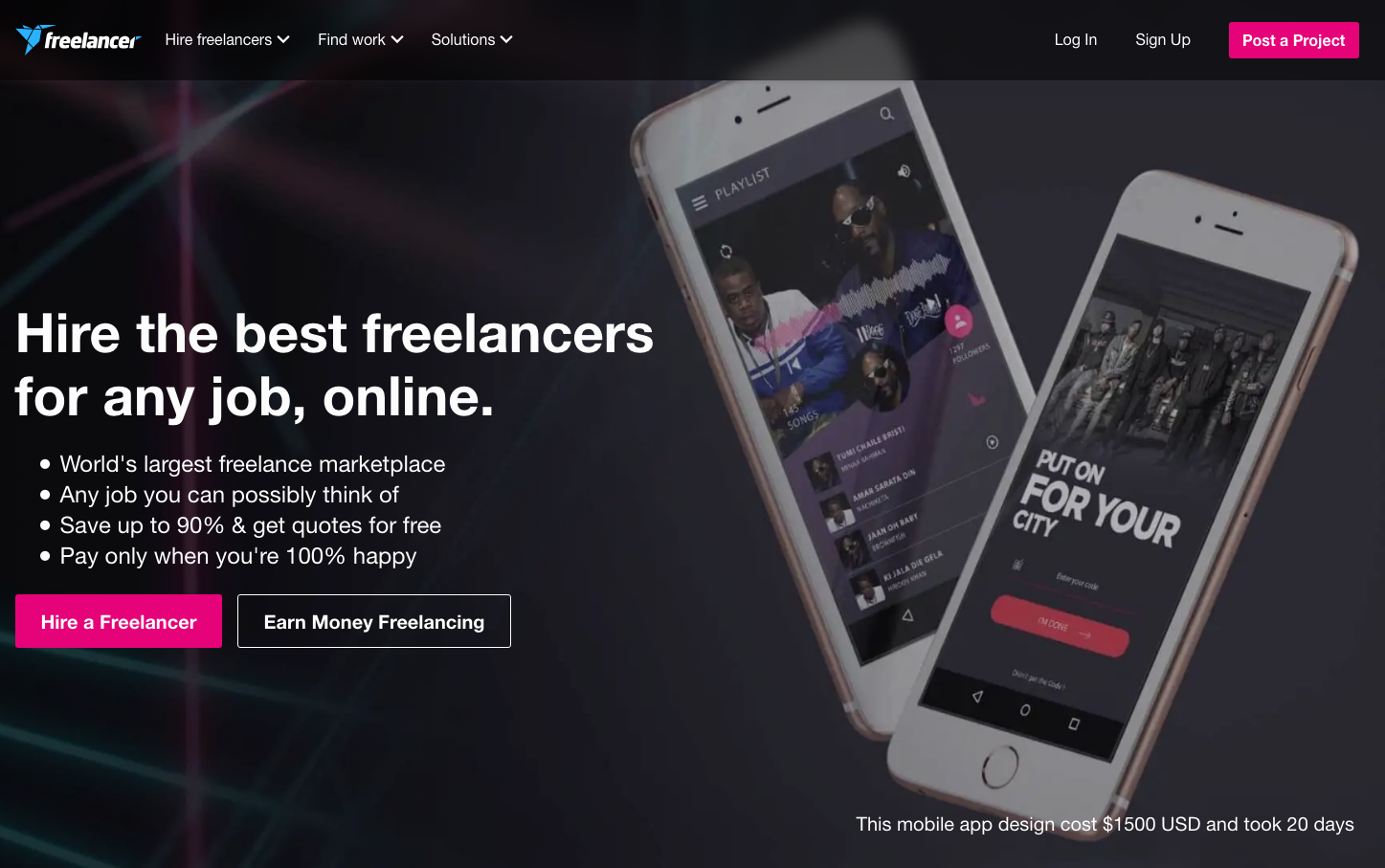 Freelancer's brand radiates electric confidence through its vibrant magenta primary color against nocturnal dark backgrounds. The bold Roboto typography creates an assertive, professional tone that speaks directly to ambitious entrepreneurs and skilled professionals seeking premium opportunities.