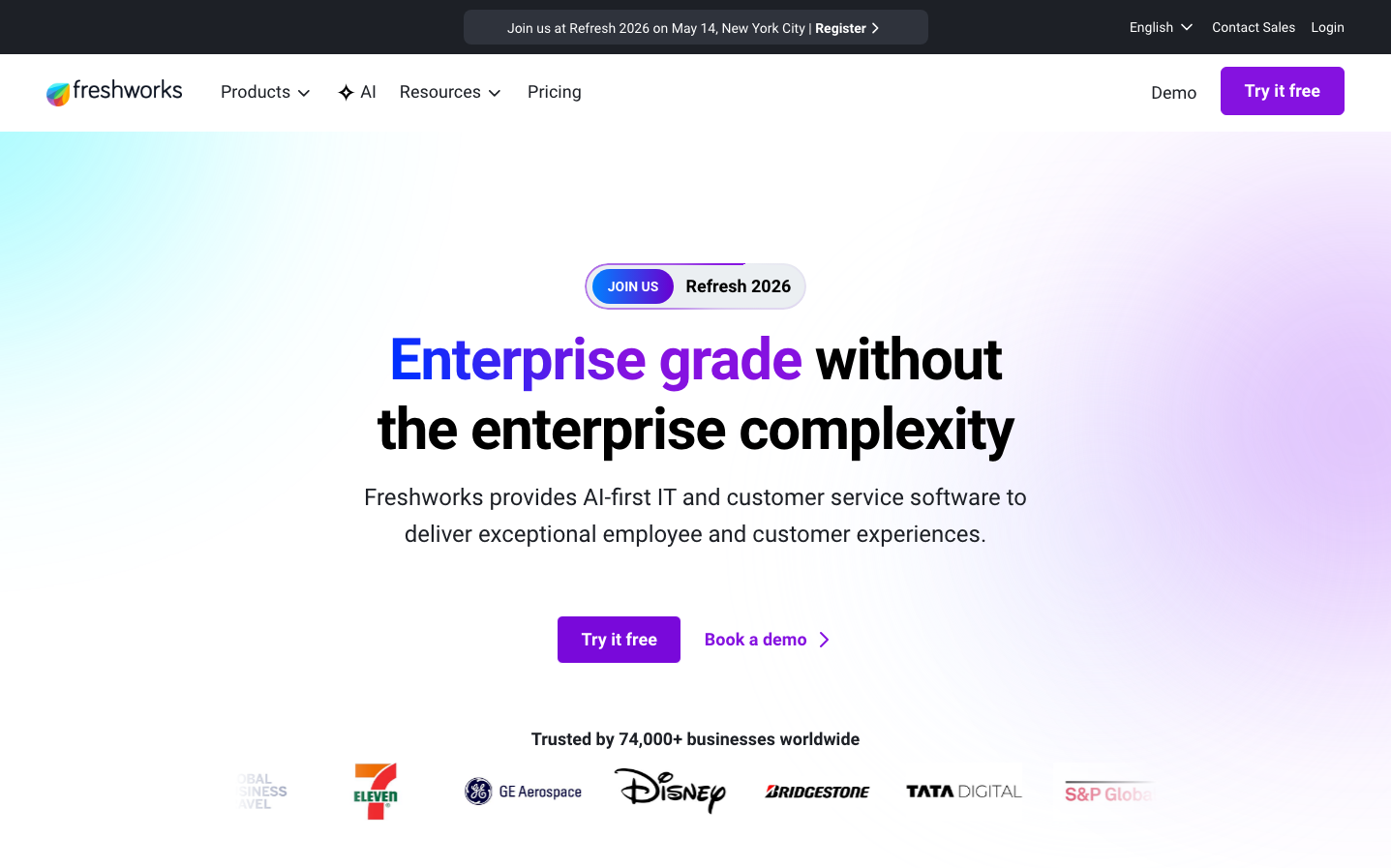 Freshworks embraces a vibrant electric gradient aesthetic that transitions from cobalt blue to vivid purple, creating an energetic tech-forward atmosphere. The bold Roboto typography at 60px headlines commands attention while the dreamy pastel background gradient from mint to lavender suggests innovation without intimidation.