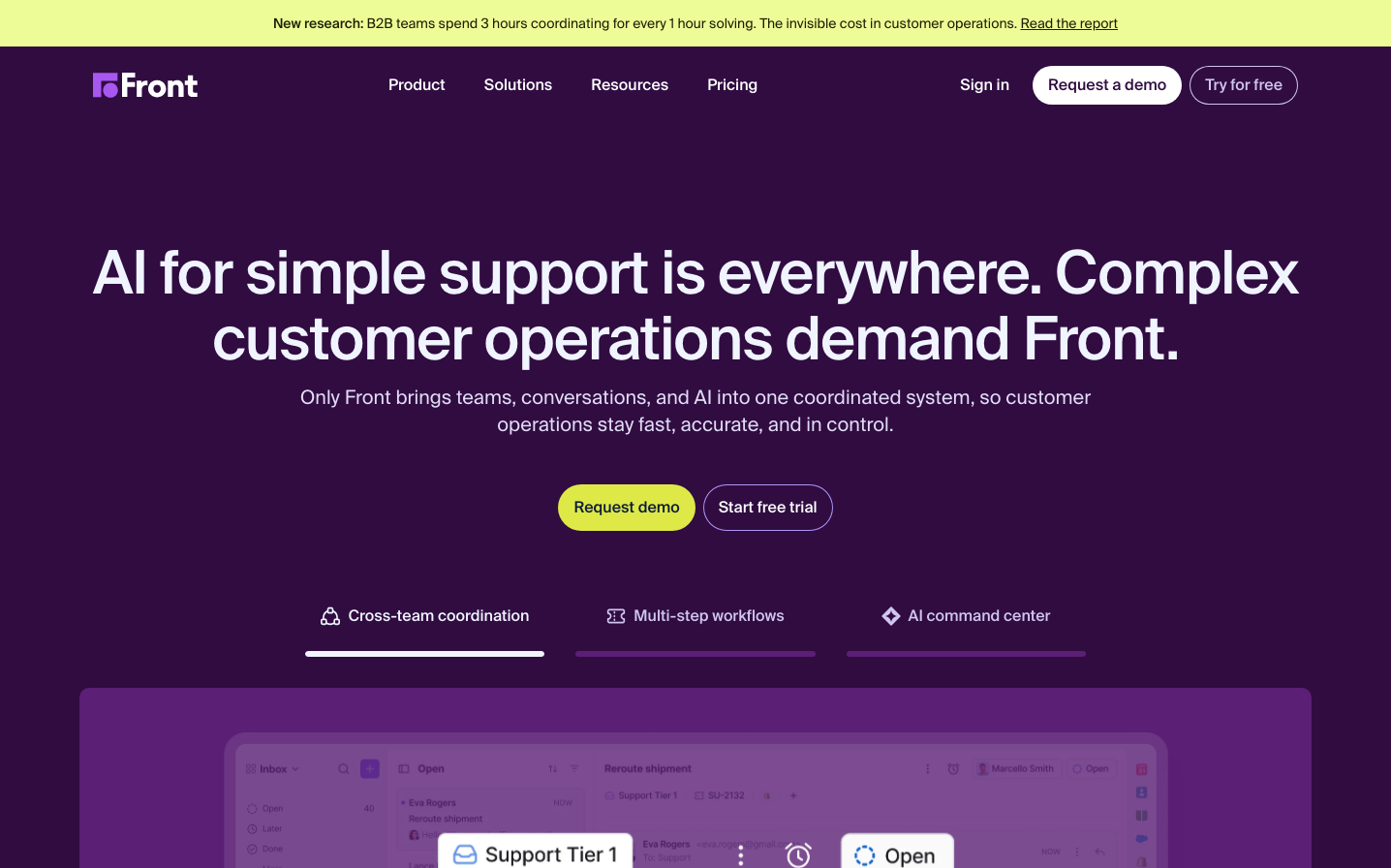 Front embodies a nocturnal enterprise aesthetic with its deep purple gradient backdrop that evokes late-night operations and AI sophistication. The Suisse International typography creates a Swiss precision feel while the acid-green accent creates electric urgency against the cosmic darkness.