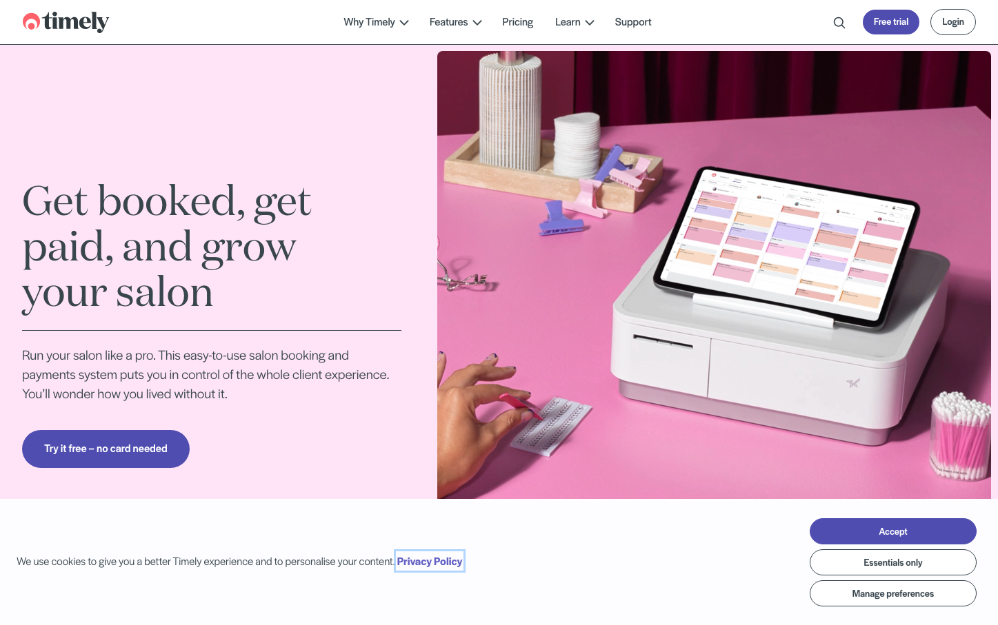 Timely radiates salon sophistication through a deliberately feminine pink gradient backdrop paired with premium serif headlines. The brand balances playful beauty industry aesthetics with professional SaaS credibility, creating an approachable yet authoritative presence for salon owners.