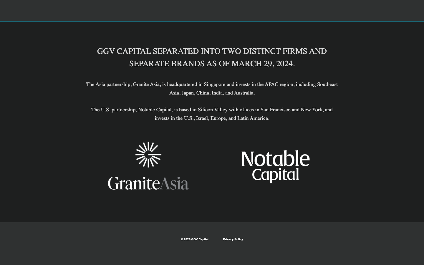 Dramatic dark backgrounds with surgical white typography and minimal cyan accent lines that feel like blueprints for the future - unmistakably venture capital institutional design