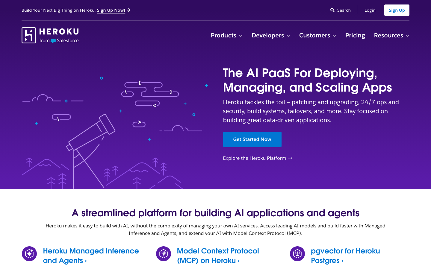 Heroku's brand radiates nocturnal innovation with its deep purple cosmos dotted by electric cyan accents. The Avant Garde typography commands attention with geometric authority while wireframe illustrations suggest technical sophistication without intimidation.