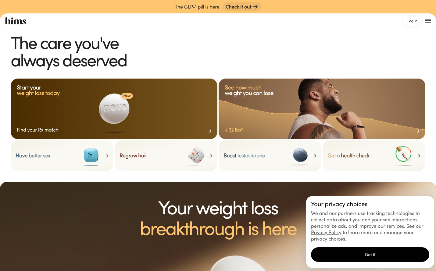 Hims uses warm, gradient-rich earth tones and SofiaProWeb typography to create an approachable yet premium wellness aesthetic. The design balances medical authority with lifestyle aspiration through golden browns and confident messaging.