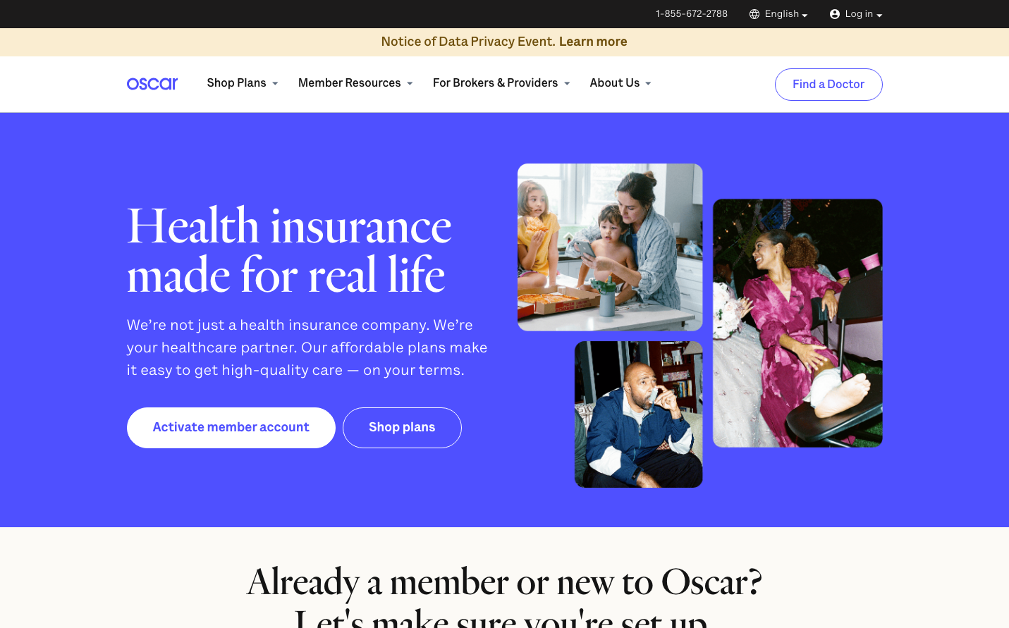 Oscar Health creates an editorial healthcare brand that feels more like a premium lifestyle magazine than traditional insurance. The vibrant purple hero section paired with serif headlines and warm lifestyle photography communicates approachable sophistication and human-centered care.