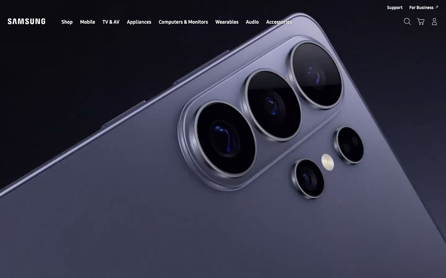 The distinctive electric blue gradient backgrounds combined with clean product photography on white space, using the forma-djr-micro typeface's subtle geometric character to create a tech-forward but accessible enterprise feeling.