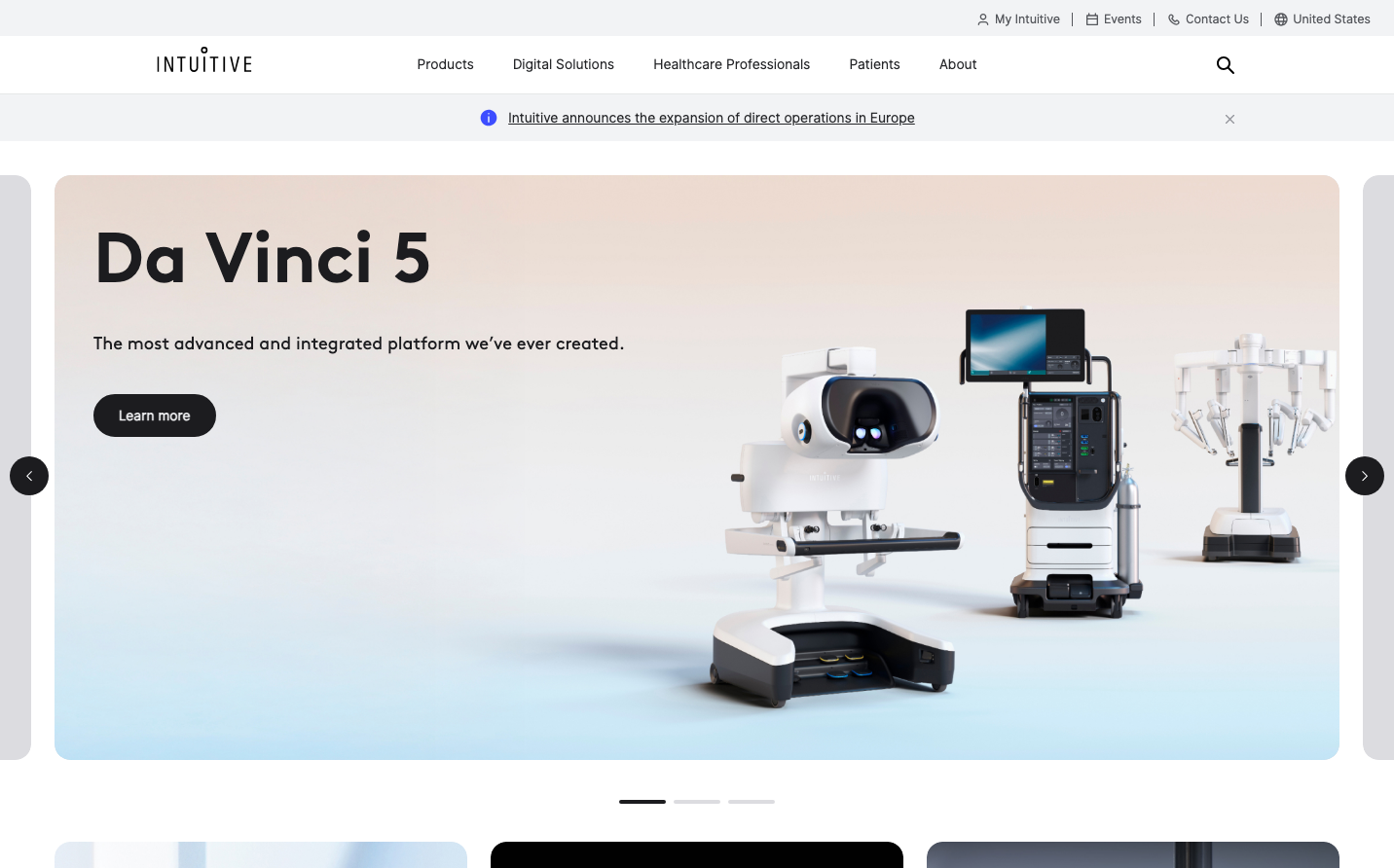 Intuitive presents surgical-grade sophistication through a whisper-quiet aesthetic that lets revolutionary medical technology take center stage. The brand radiates cathedral-like spaciousness with museum-quality precision, where every element feels orchestrated with life-saving intentionality.