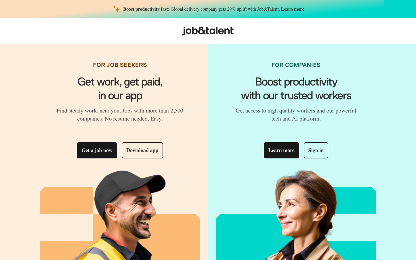 Job&Talent employs a warm-meets-digital aesthetic with gradient peach-to-teal backgrounds that create an approachable, optimistic atmosphere. The dual-sided layout with contrasting warm (job seekers) and cool (companies) sections tells a story of human connection bridging both sides of the employment equation.