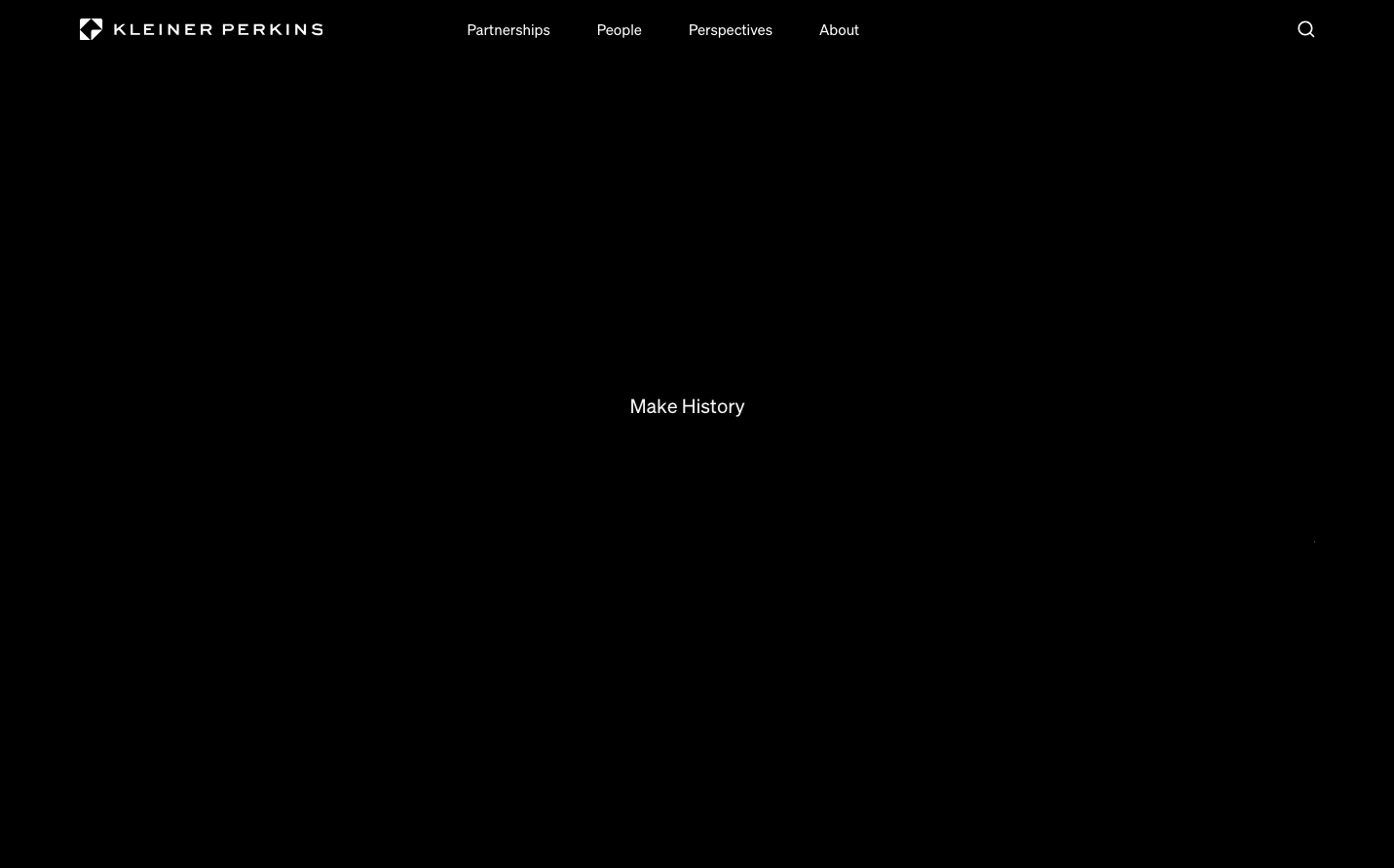 Kleiner Perkins employs a radically minimal design centered on stark black and white contrast with the Söhne typeface creating an intellectual, gallery-like atmosphere. The design philosophy prioritizes content over decoration, using dramatic negative space and subtle typography to project understated authority.