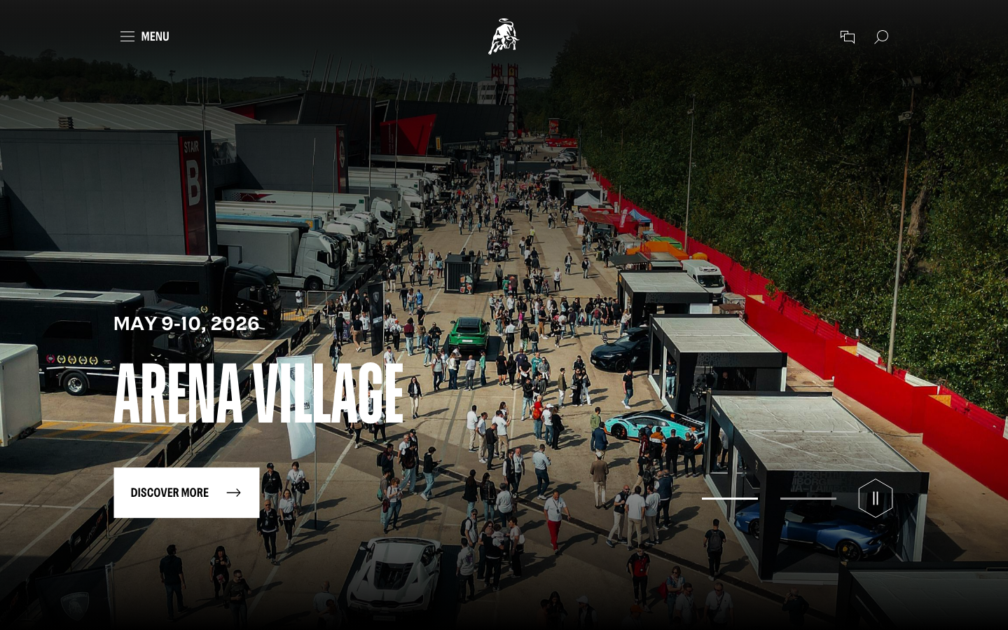 Lamborghini's brand exudes theatrical automotive luxury through dramatic aerial photography and bold geometric typography. The signature red racing stripe cuts through the composition like a blade, creating visceral energy that mirrors the brand's supercar DNA. Custom LamboType font delivers commanding presence with oversized headlines that demand attention.