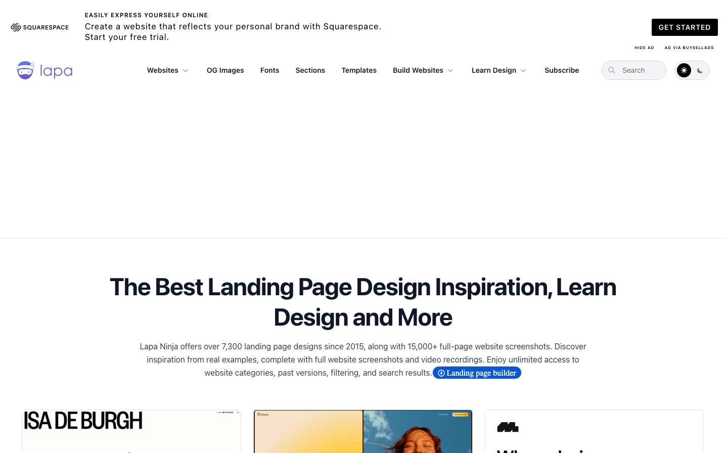 Lapa embodies editorial sophistication through bold Inter typography hierarchy and generous whitespace, creating a gallery-like browsing experience for design inspiration. The minimal color palette relies heavily on strategic typography scale jumps (from 12px to 48px) to create visual drama without decorative elements.