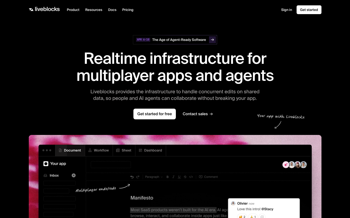 Liveblocks presents a cosmic collaboration aesthetic with vibrant holographic gradients against deep space blacks. The Suisse typography creates technical precision while the prismatic color palette evokes the magic of real-time multiplayer experiences - like Aurora Borealis meets developer tools.