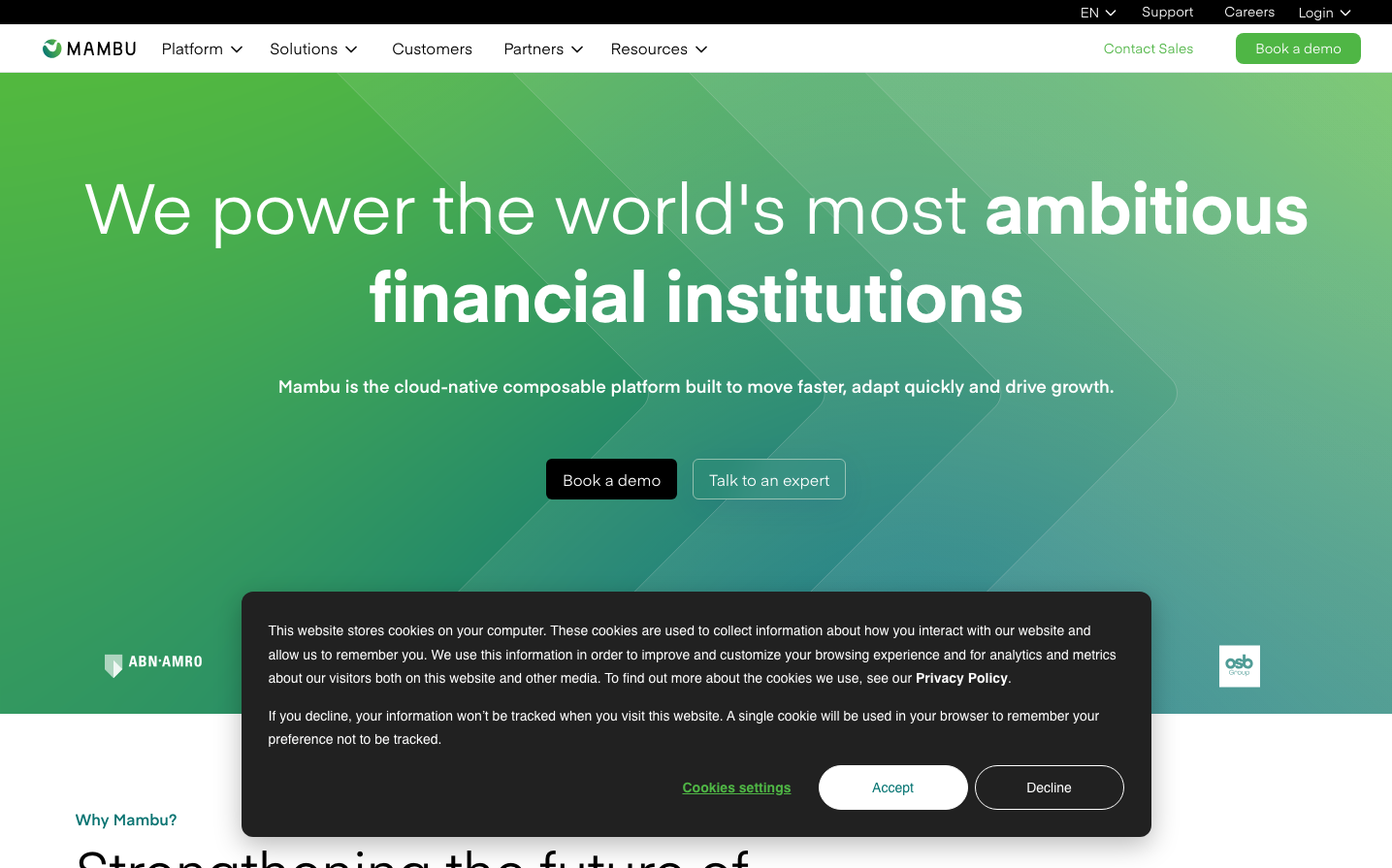 Mambu projects financial innovation through an optimistic emerald-to-teal gradient that feels energetic yet trustworthy. The Eina typography strikes a balance between approachable friendliness and corporate authority, while the expansive green gradient hero creates an atmosphere of growth and possibility.