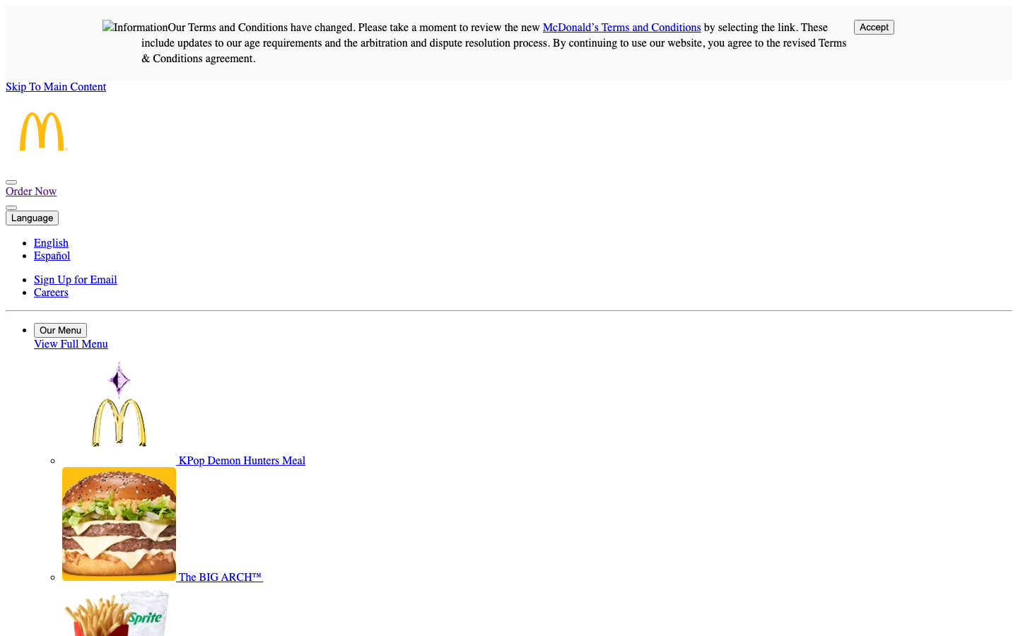 Generous whitespace around hero elements like the golden arches and food images, creating breathing room that lets the iconic branding dominate. Compact navigation spacing maintains utility while the overall layout feels uncluttered.