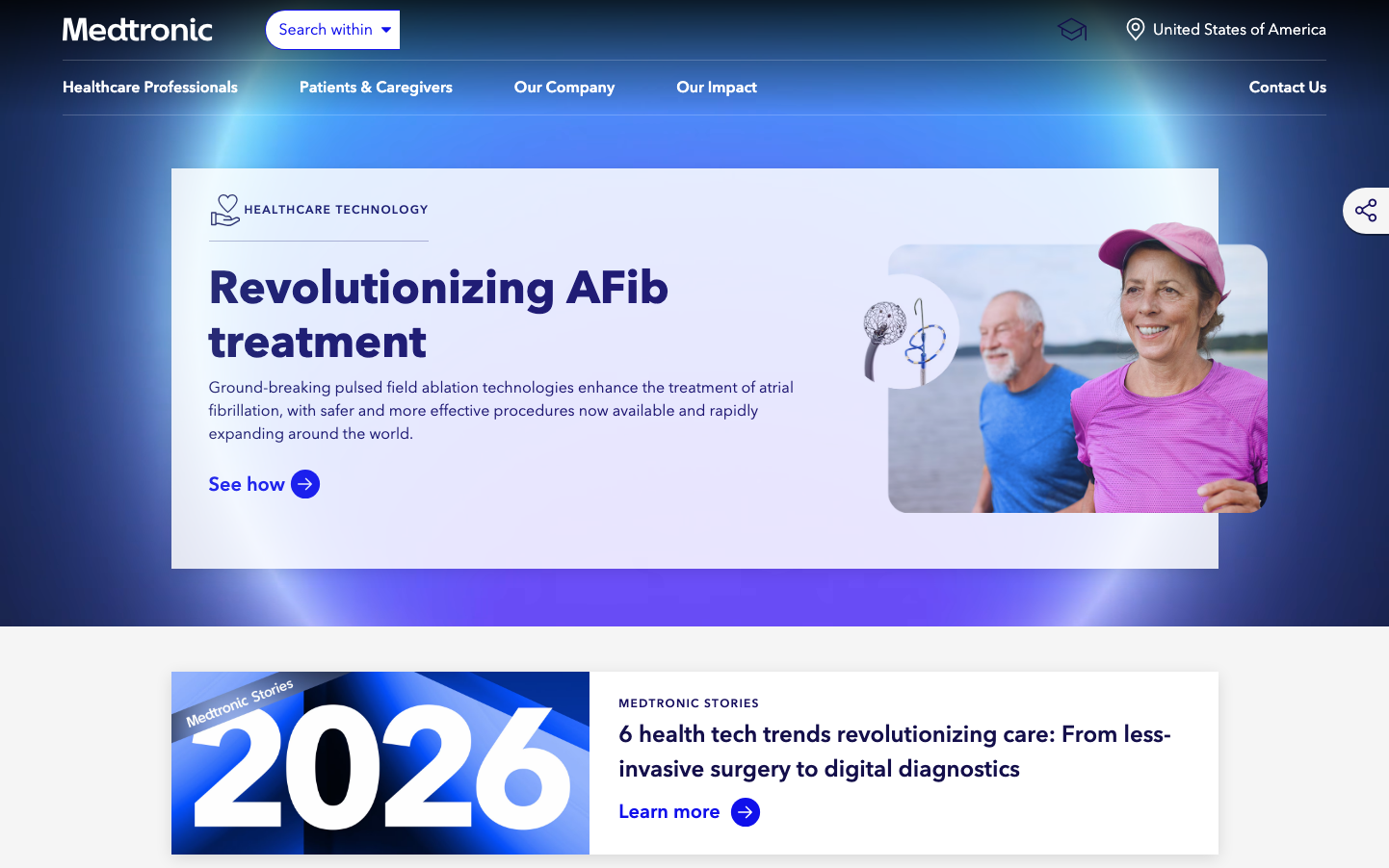 Medtronic projects authoritative healthcare leadership through a sophisticated medical blue palette that conveys trust and clinical precision. The design balances professional gravitas with human warmth, using expansive whitespace and confident typography to create an atmosphere of premium healthcare innovation.
