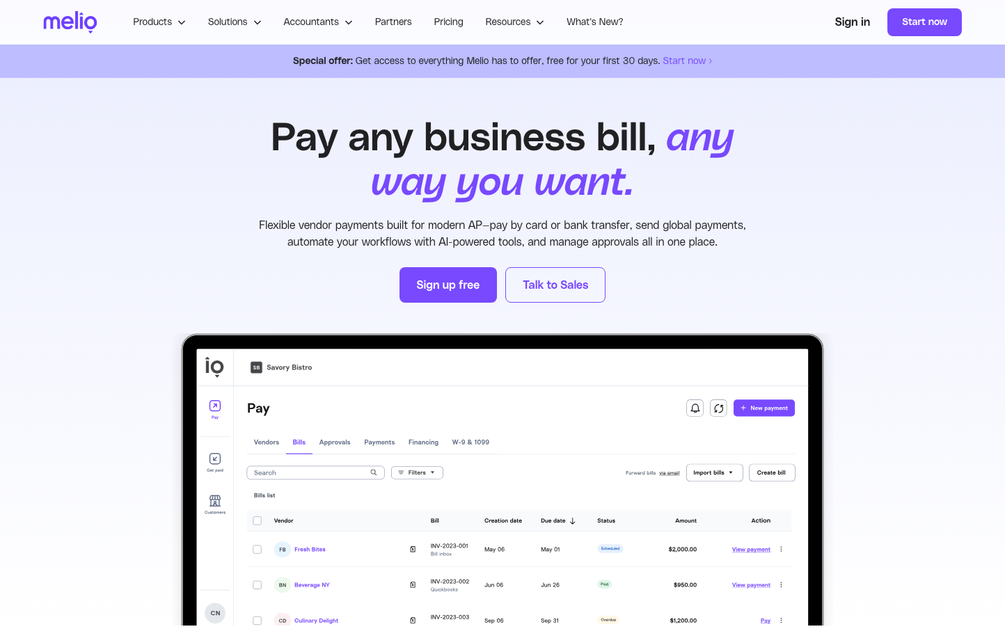 Melio employs a playful yet professional aesthetic centered around a distinctive violet-purple signature color that bridges fun and fintech credibility. The brand uses generous whitespace and clean typography to create an approachable, optimistic atmosphere for business payment solutions.