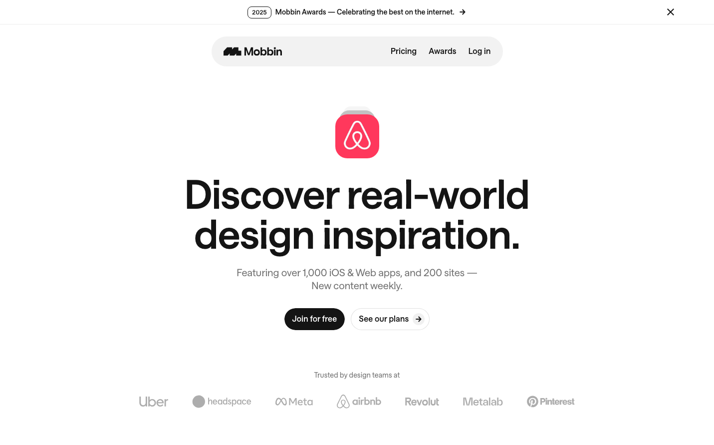 Mobbin embodies a sophisticated, minimalist aesthetic with massive typography hierarchy and generous whitespace that commands attention. The monochromatic palette with selective color accents creates a gallery-like environment that elevates the showcased design work, positioning Mobbin as the discerning curator of digital design excellence.