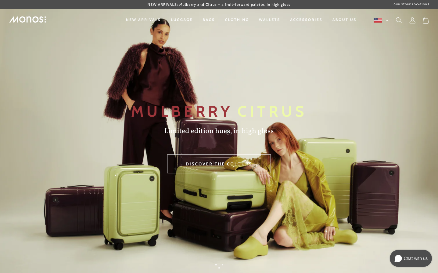 Monos crafts a sophisticated minimalist aesthetic that bridges fashion and function through editorial-style photography and restrained typography. The Vollkorn serif body text creates literary sophistication while Cabin sans-serif headings provide contemporary structure, evoking premium travel gear for design-conscious nomads.