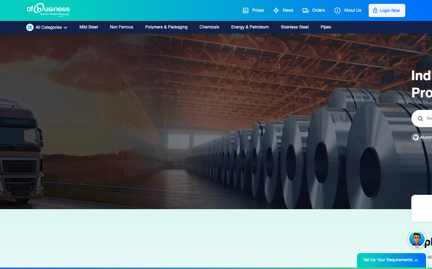 OfBusiness presents a bold industrial aesthetic that merges electric turquoise energy with professional navy authority. The Inter typography system creates operational precision while the dramatic warehouse imagery with aluminum coils establishes manufacturing credibility and B2B gravitas.