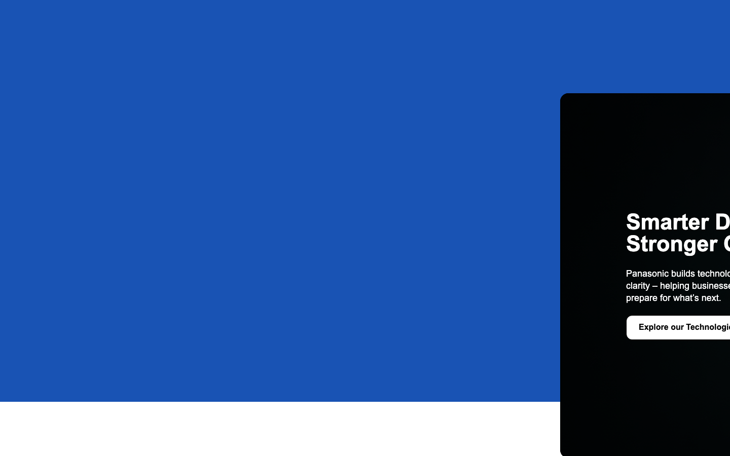 Panasonic's brand aesthetic combines bold corporate confidence with futuristic optimism, anchored by an authoritative royal blue that commands attention across the entire visual field. The typography hierarchy using Proxima Nova creates a sophisticated technical narrative that balances approachability with enterprise credibility.
