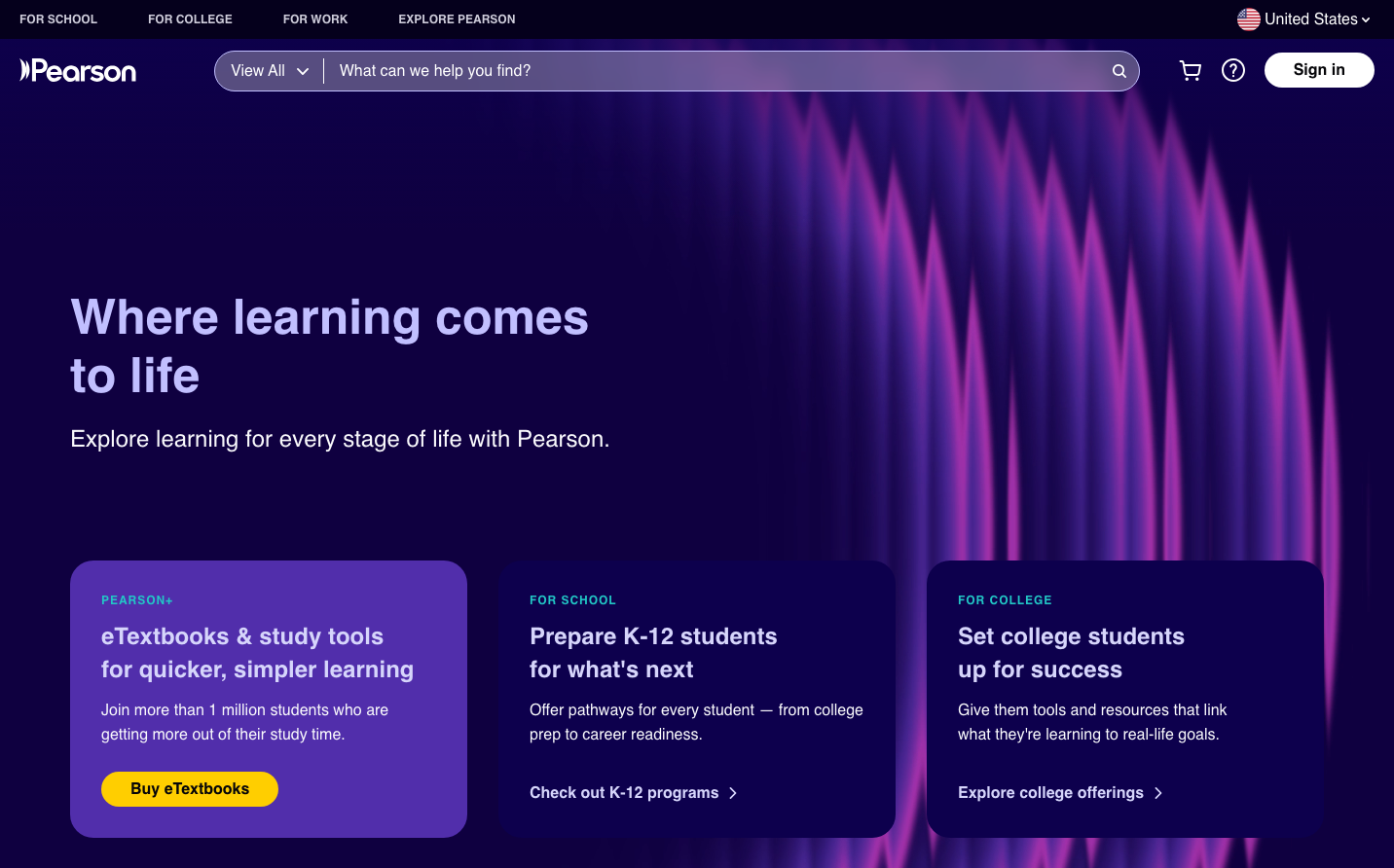 Pearson creates a nocturnal learning environment with deep purple-to-pink gradients that evoke late-night study sessions and the electric moment of understanding. The Plus Jakarta Sans typography strikes a balance between academic authority and approachable warmth, while the aurora-like background suggests knowledge illumination.