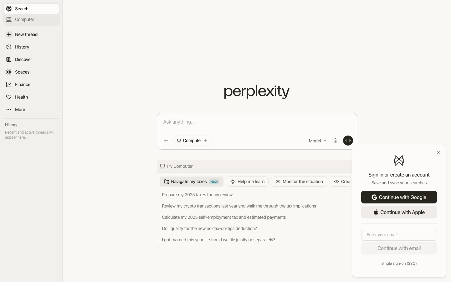 Perplexity embodies intellectual minimalism with its warm cream background and ethereal lowercase wordmark, creating an atmosphere of scholarly contemplation. The design feels like a digital library reading room - spacious, focused, and designed for deep thinking rather than hurried interactions.
