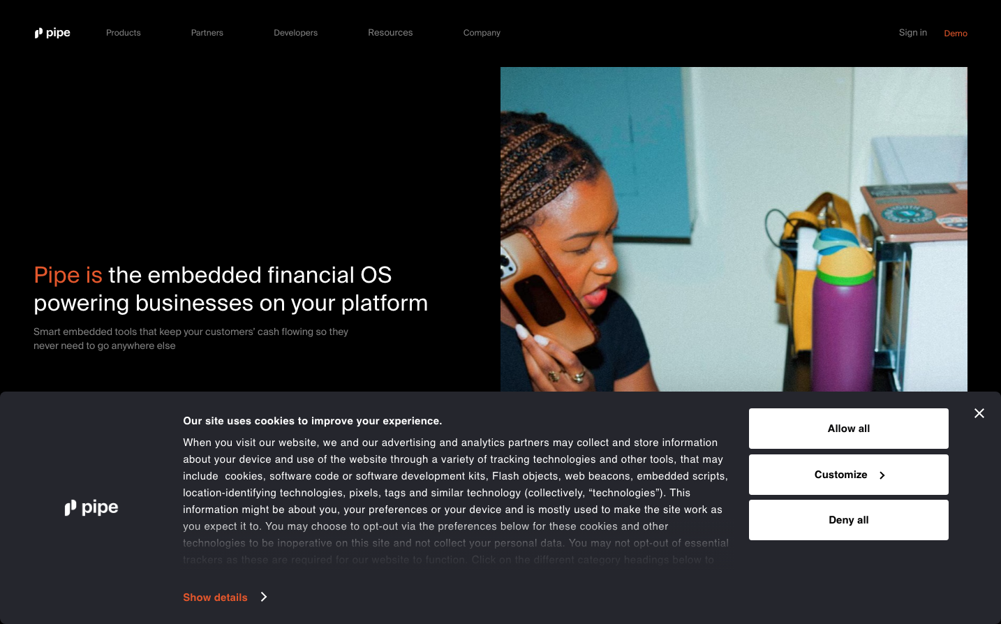 Pipe embraces a bold financial-tech aesthetic with stark black backgrounds and strategic orange accent lighting that creates an almost nocturnal, high-stakes trading floor atmosphere. The Suisse Font typography communicates Swiss precision and banking heritage, while the dramatic contrast suggests this is serious financial infrastructure for sophisticated users.