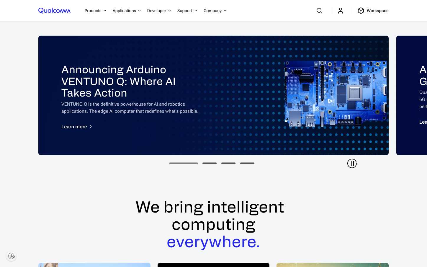 Qualcomm presents a bold, tech-forward identity that balances deep midnight blues with brilliant electric accents, creating an atmosphere of premium innovation. The hero carousel showcases cutting-edge hardware photography against dramatic gradient overlays, while clean sans-serif typography maintains enterprise credibility.