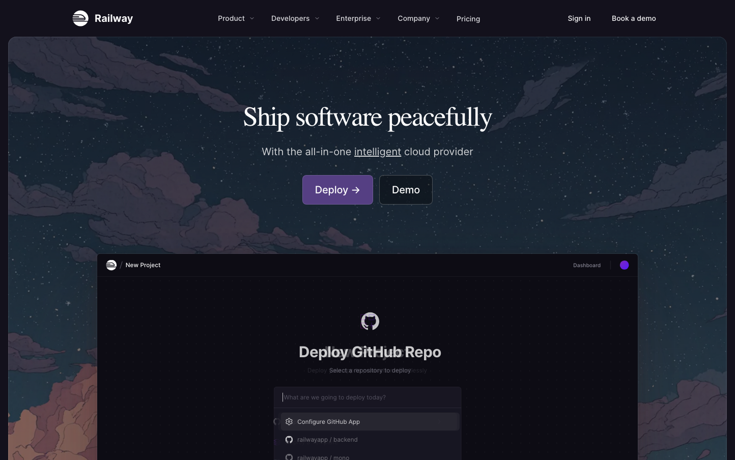 Railway creates a cosmic, developer-centric aesthetic that feels like coding in deep space. The signature purple (#59497a) paired with ethereal mountain silhouettes against a star-filled night sky evokes a sense of peaceful productivity and infinite possibility.