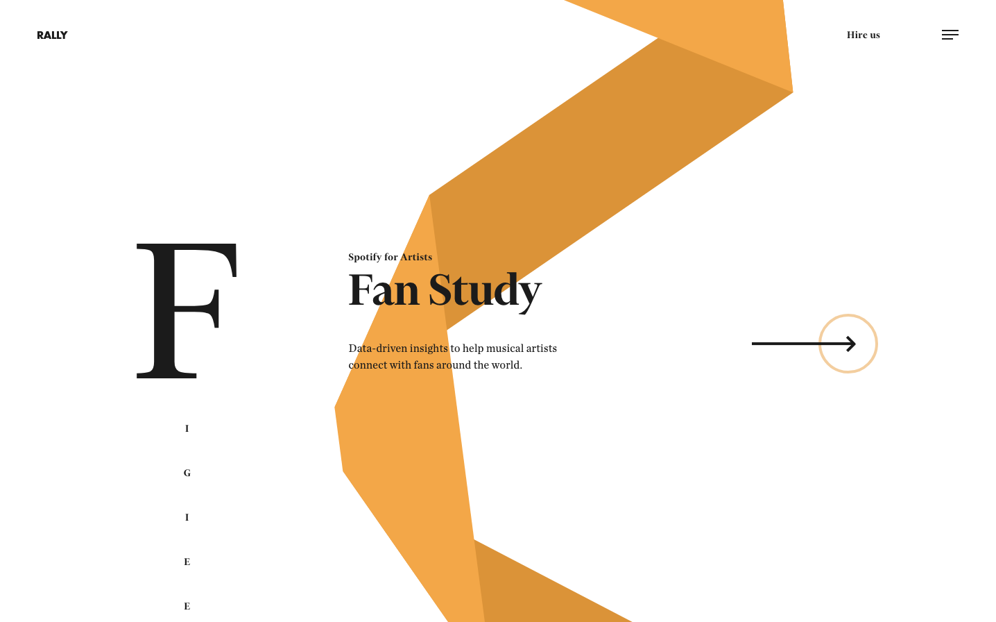 Rally embodies a sophisticated editorial aesthetic that merges premium publishing with data analytics, using warm golden orange ribbons that flow like silk through stark typographic layouts. The brand feels like a luxury magazine for the music industry, where classical serif typography meets contemporary geometric abstractions.