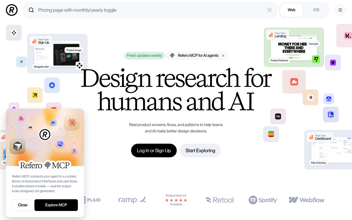 Refero embodies sophisticated design intelligence through massive editorial typography (96px headlines) and carefully orchestrated UI card fragments that float like design specimens. The brand feels like a premium design laboratory where human creativity meets AI precision, creating an atmosphere of professional curation and systematic exploration.