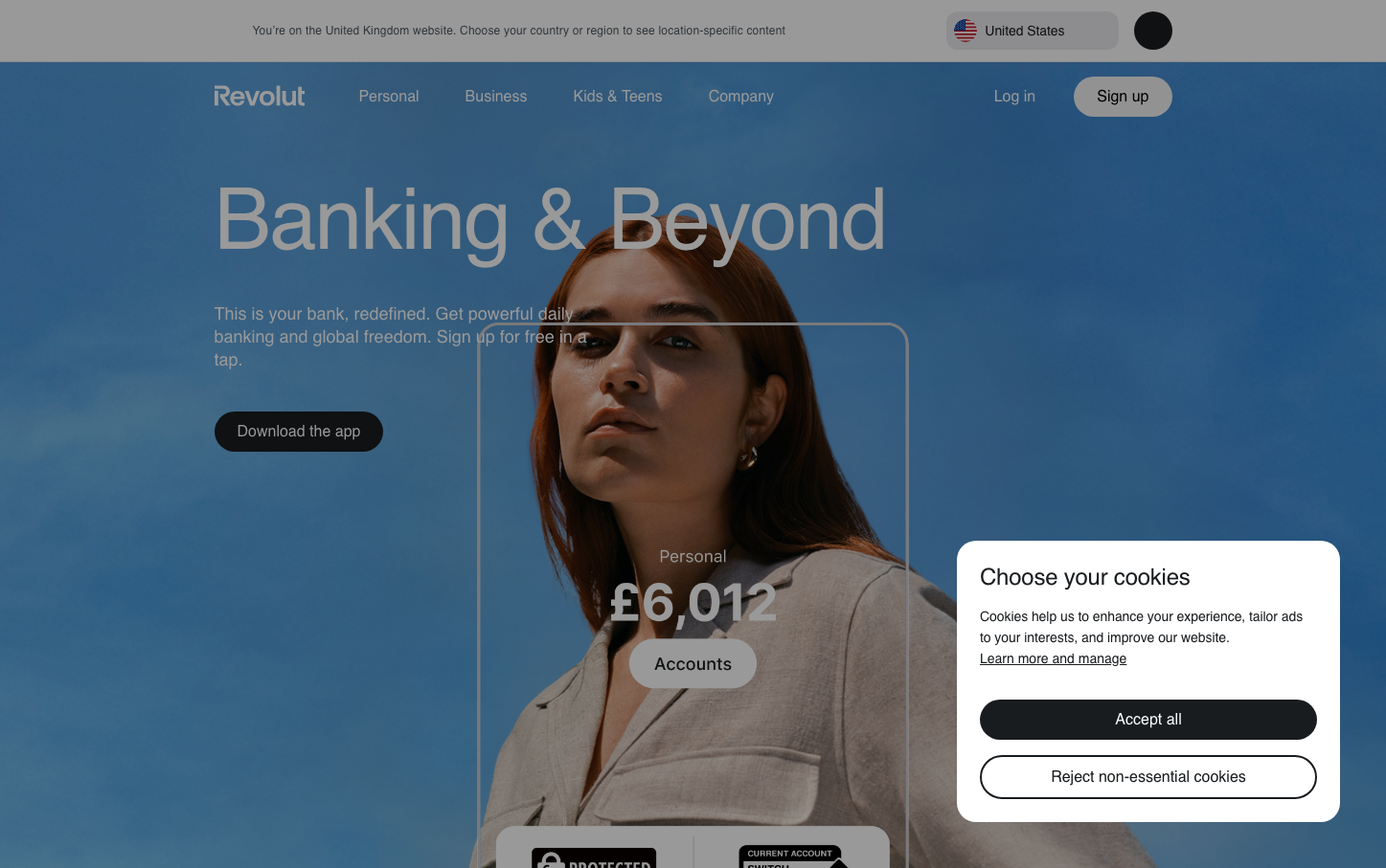Revolut presents a bold, gradient-driven aesthetic that transforms traditional fintech sterility into an aspirational lifestyle brand. The deep blue-to-purple gradient background creates an immersive, almost cinematic atmosphere that suggests forward momentum and digital sophistication, while the ultra-large Aeonik Pro typography conveys confident authority.