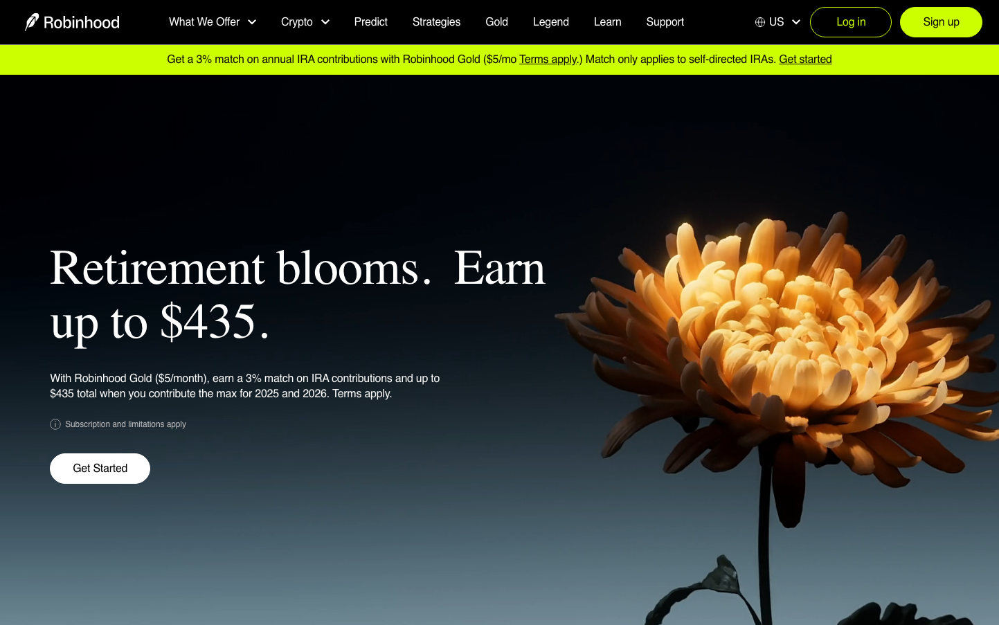 Robinhood creates a sophisticated nocturnal atmosphere with electric chartreuse accents against deep blacks, positioning investment as both accessible and premium. The typography mixes elegant serif headlines (Martina Plantijn) with clean sans-serif UI elements, communicating financial gravitas with modern approachability.