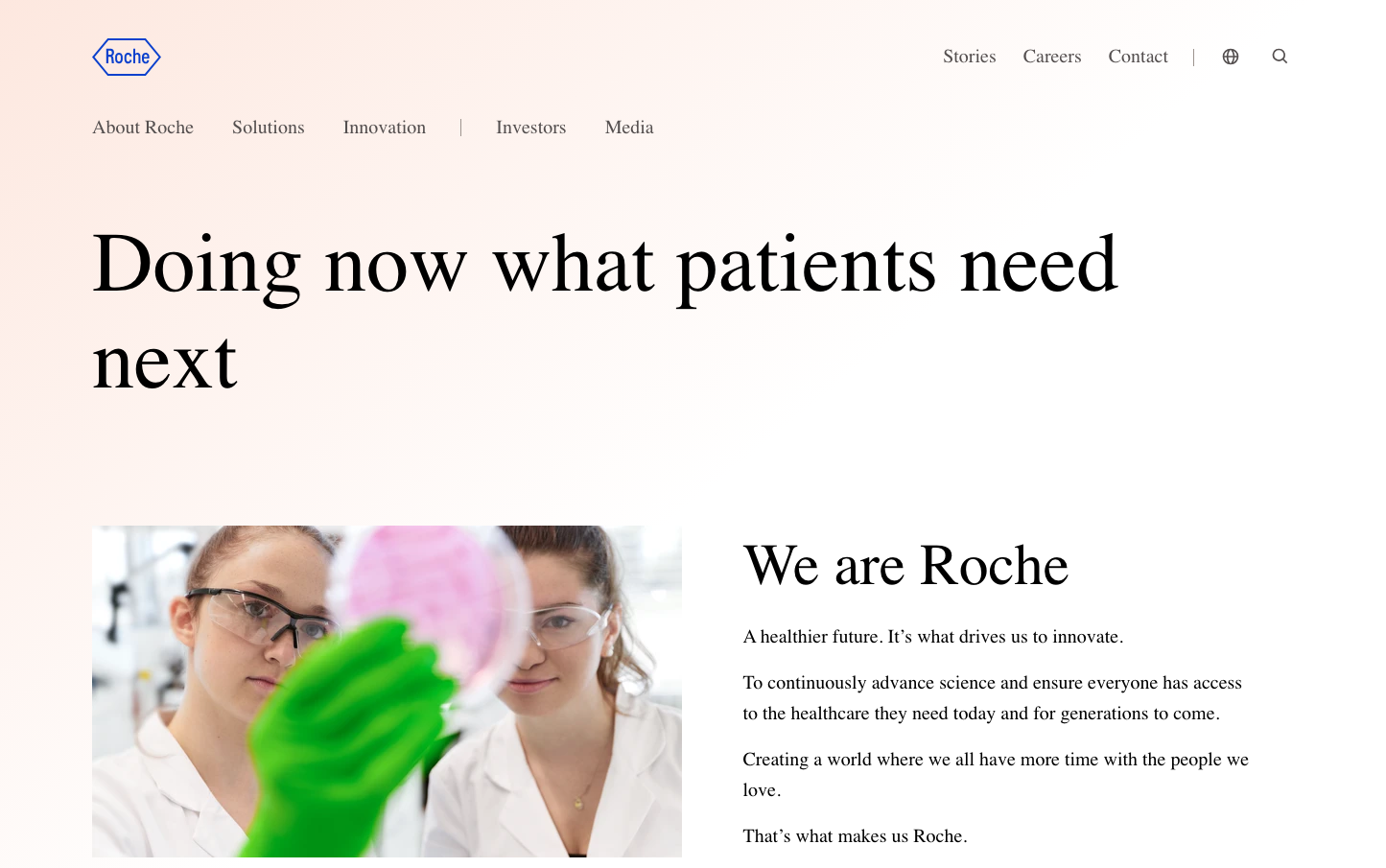Roche's aesthetic communicates pharmaceutical precision through ethereal lightness - ultra-thin typography on pearl-toned backgrounds creates an almost weightless, scientific elegance. The blush-pink foundation paired with whisper-thin letterforms evokes trust through transparency rather than corporate heaviness.
