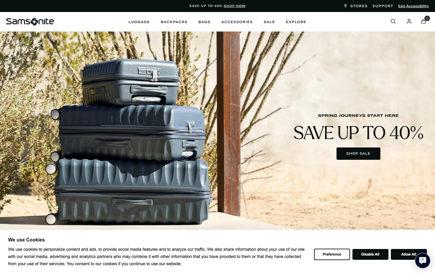 Samsonite embodies adventure-ready sophistication through desert-toned photography and industrial typography. The brand uses GT-America typeface to communicate reliability and wanderlust, while the warm beige and charcoal palette evokes exploration and professional travel confidence.