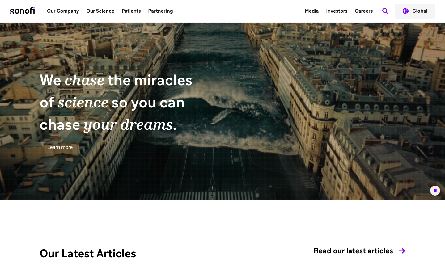 Sanofi projects pharmaceutical gravitas through cinematic hero imagery paired with elegant, scientific precision. The design balances human warmth with clinical authority, using deep purples that evoke both medical expertise and innovation.