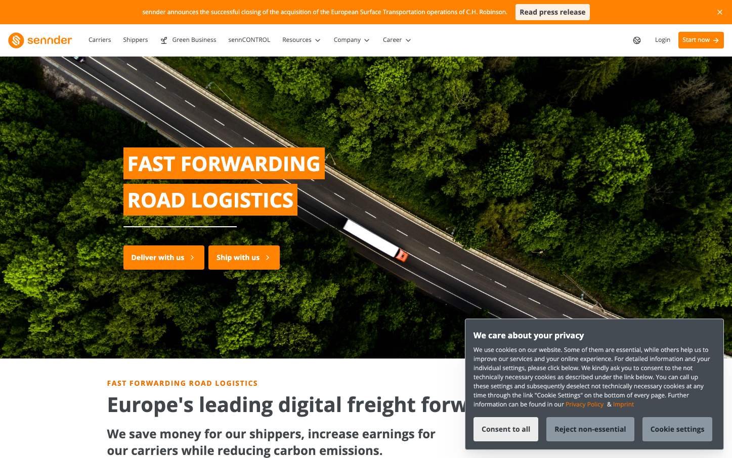 Sennder's brand radiates urgency and momentum through its commanding tangerine orange color system paired with bold, industrial typography. The design captures the energy of fast-moving logistics with high-contrast text overlays on dynamic aerial highway imagery, creating a sense of speed and reliability.