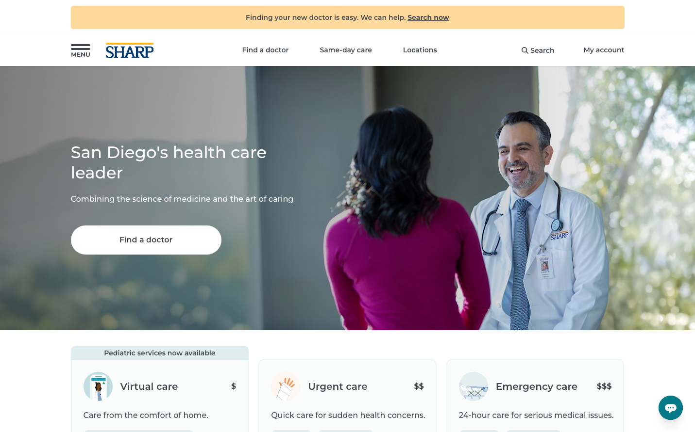 Sharp Healthcare employs a distinctive healthcare aesthetic that balances professional medical authority with warm human connection. The Montserrat typography creates a friendly yet credible voice, while the clean white interface with strategic use of Sharp blue conveys medical precision without clinical coldness.