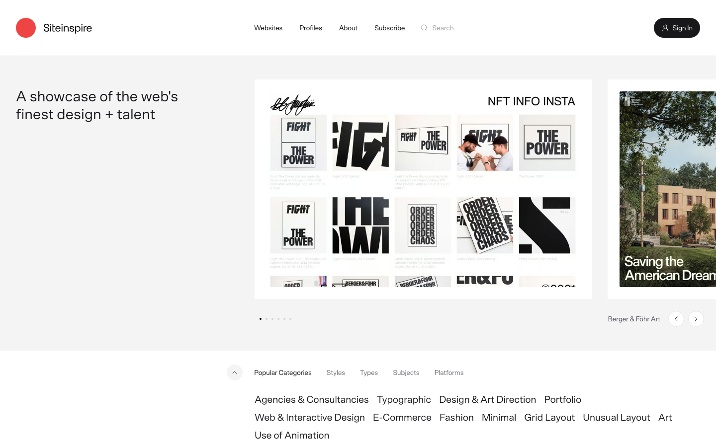 Siteinspire embodies gallery minimalism with its stark red accent against pure monochrome - creating a confident, editorial aesthetic that positions design work as high art. The ultra-light typography whispers rather than shouts, letting the showcased designs command attention while maintaining an air of sophisticated curation.