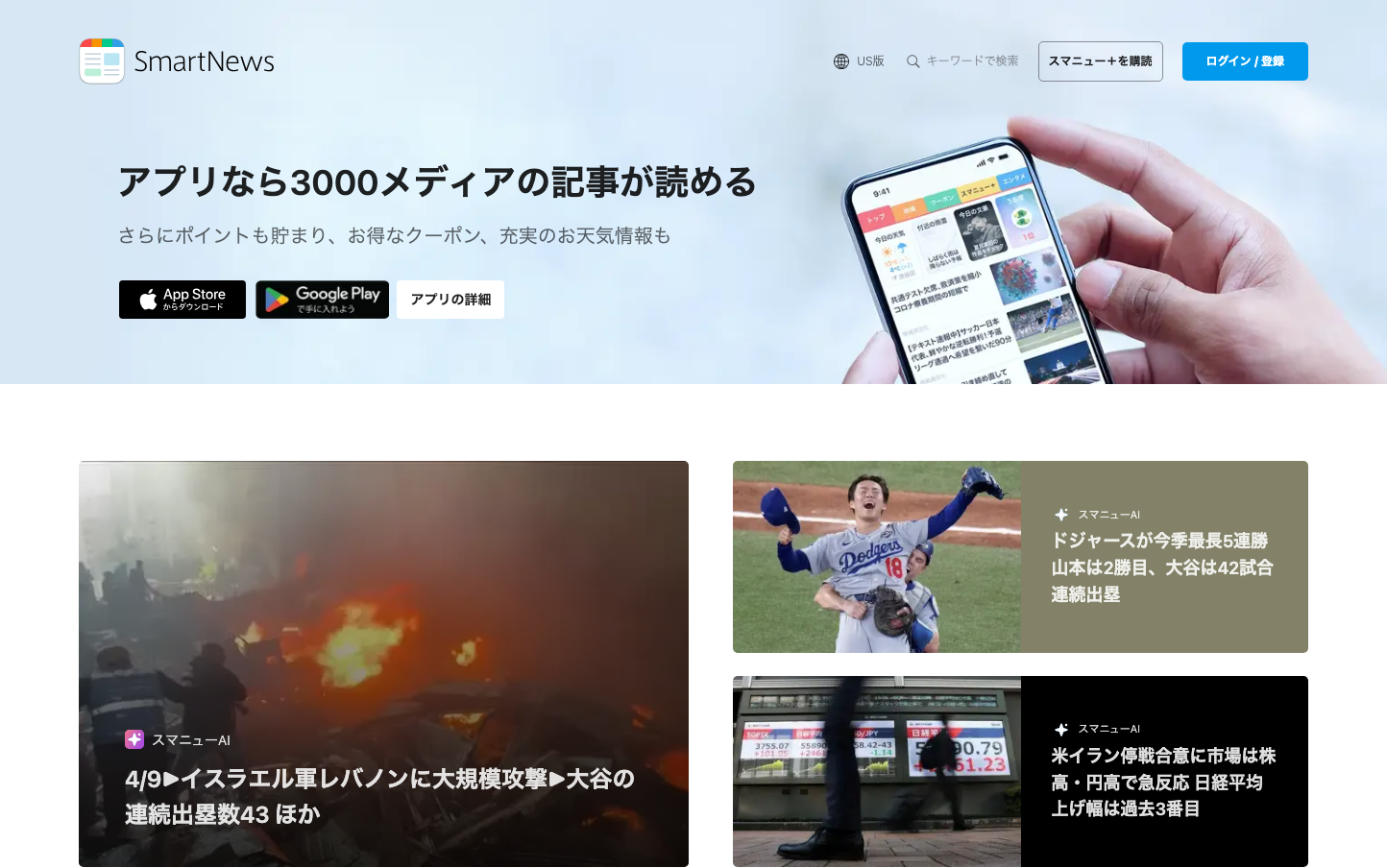 SmartNews embodies a news-forward aesthetic with subtle gradients and smartphone-centric imagery that emphasizes mobile-first consumption. The warm blue (#329fe7) creates trust while Japanese typography suggests global news accessibility.