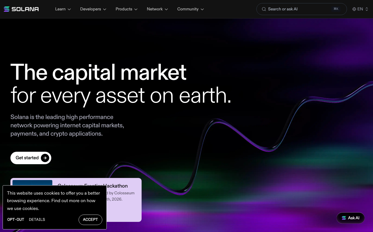 Solana's brand radiates crypto-native confidence through deep space blacks (#121212) punctuated by electric purple-to-teal gradients that flow like digital energy. The massive 88px Diatype headlines create bold authority while the flowing gradient ribbons suggest infinite possibility in the blockchain universe.