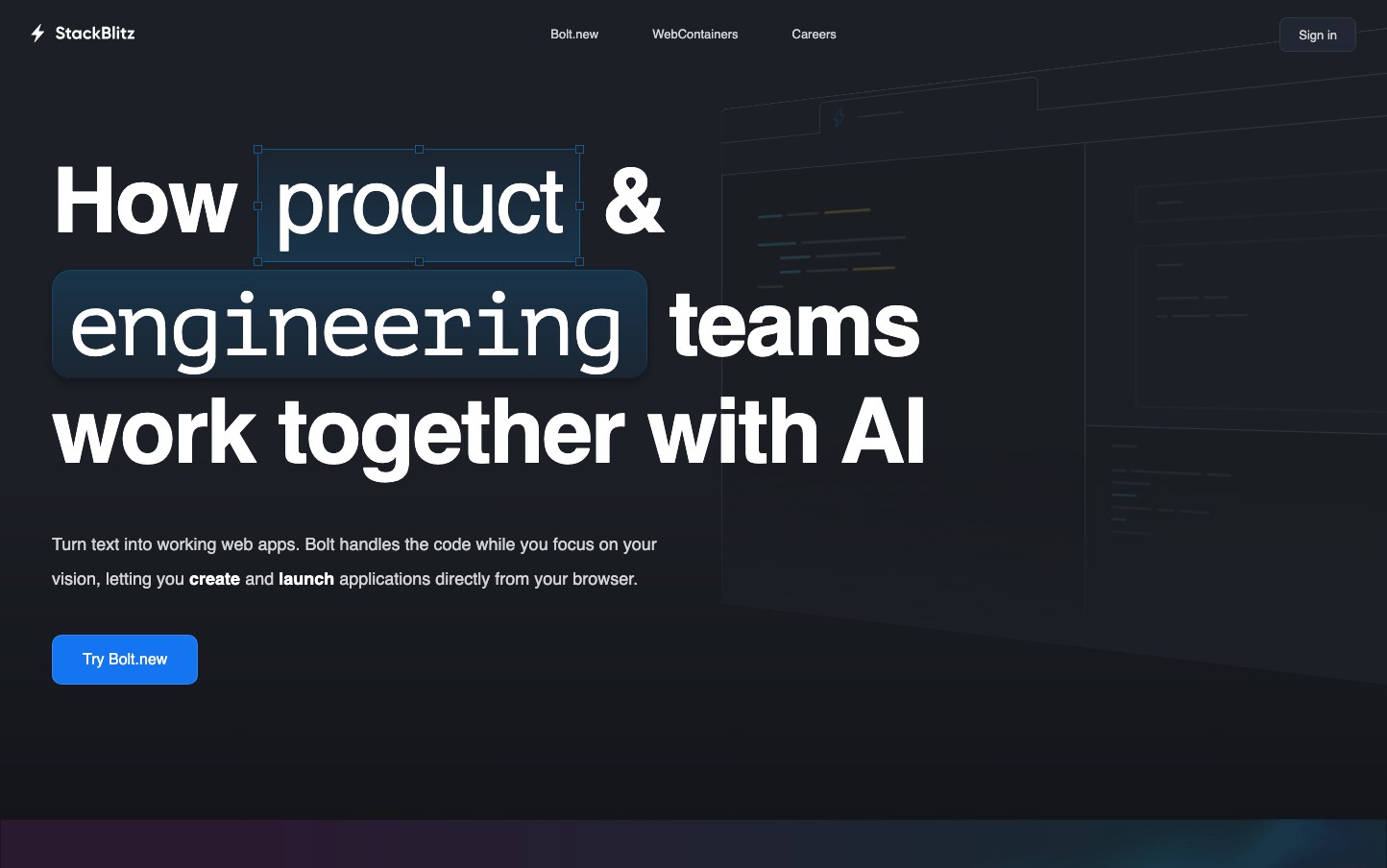The dramatic contrast between massive white typography on midnight-dark backgrounds, combined with electric blue geometric accents and subtle selection boxes around key words that mimic code editor syntax highlighting.
