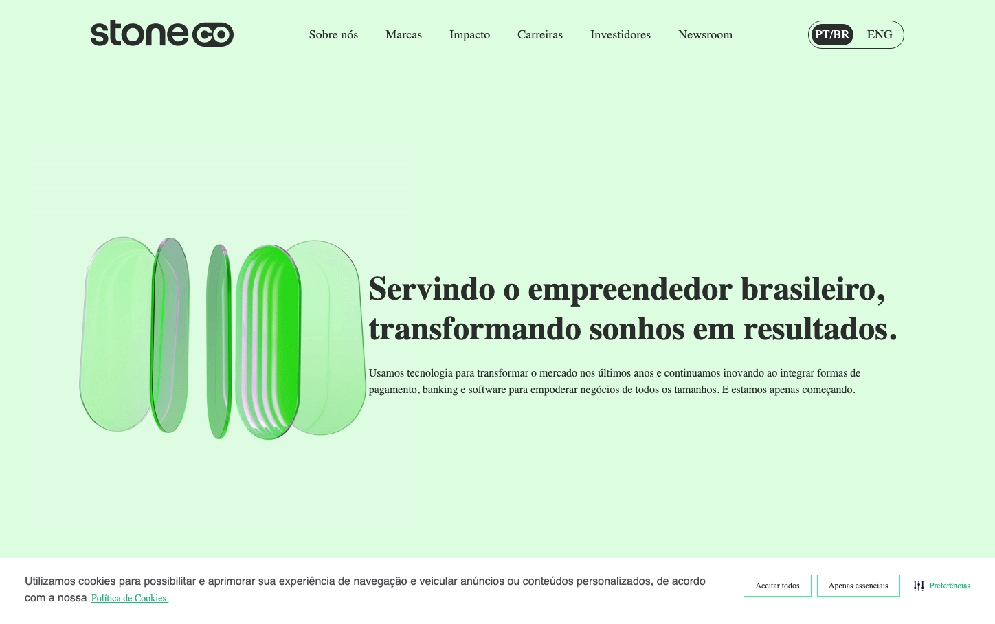 Stone's brand aesthetic centers on ethereal translucency and dimensional depth, using overlapping glass-like geometric forms in vibrant greens that create a sense of technological innovation floating in serene space. The Roobert typography maintains approachable professionalism while the abundant whitespace and layered visual elements communicate forward-thinking fintech solutions.