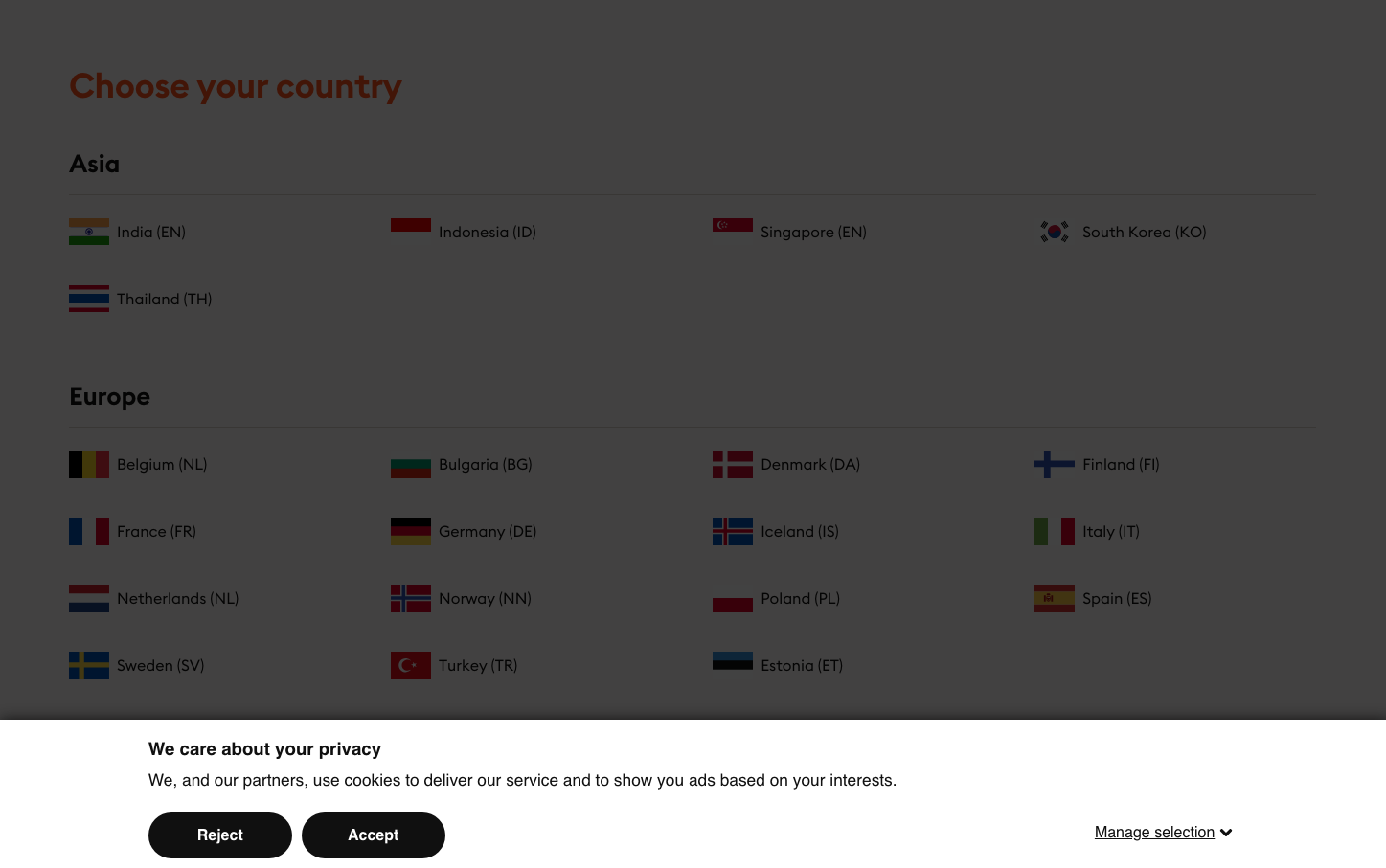 Generous vertical spacing between country sections creates clear content hierarchy, while compact flag-and-text pairings maintain scanning efficiency. The layout prioritizes quick regional selection without overwhelming choice paralysis.