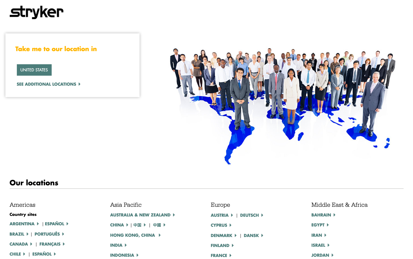 Stryker's brand aesthetic combines medical precision with global accessibility through a distinctive hybrid typography system mixing modernist Futura headings with humanistic serif body text. The bold blue world map creates an authoritative yet approachable presence that speaks to healthcare professionals worldwide.