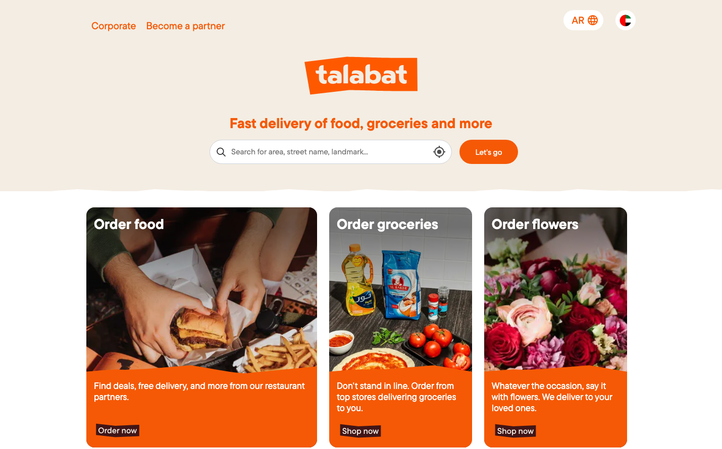 Talabat's brand radiates warmth and appetite through its dominant orange palette, creating an inviting food-focused atmosphere. The TTCommons typography feels approachable yet confident, while the service-specific color coding (red for restaurants, yellow for groceries, pink for flowers) creates an intuitive visual language that transforms delivery into lifestyle categories.