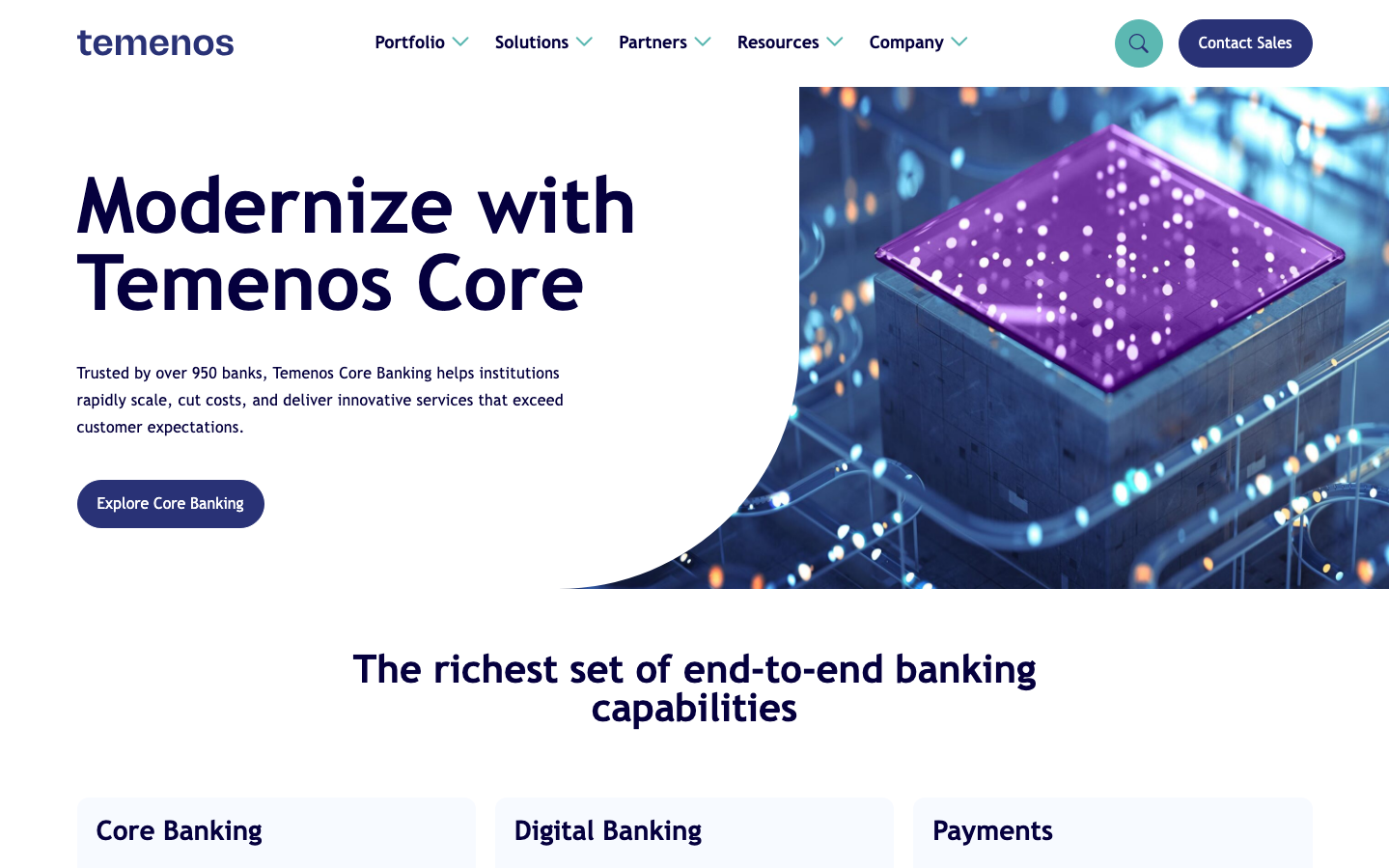 Temenos projects enterprise-grade fintech sophistication through isometric 3D illustrations paired with deep navy typography on clean white space. The brand balances corporate authority with approachable warmth, using a vibrant purple accent as a technological beacon against a backdrop of professional restraint.