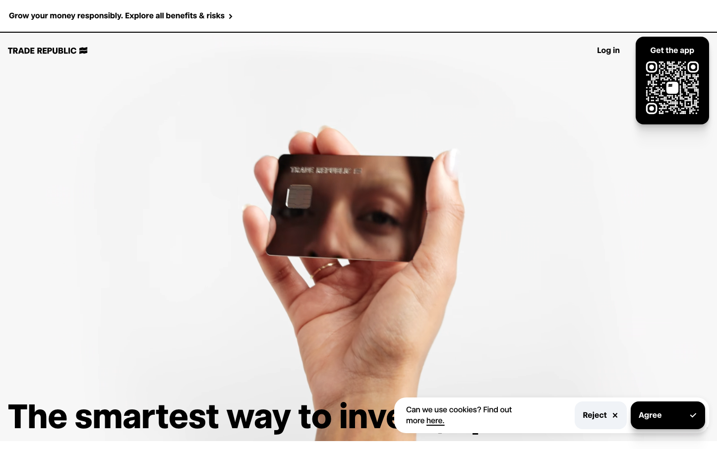 Trade Republic channels sophisticated minimalism through stark black-and-white photography paired with their custom ultra-heavy Trade Republic Sans Display typeface. The brand feels like a luxury tech product shot for a design magazine - antiseptic precision meets human warmth through the tactile card imagery.