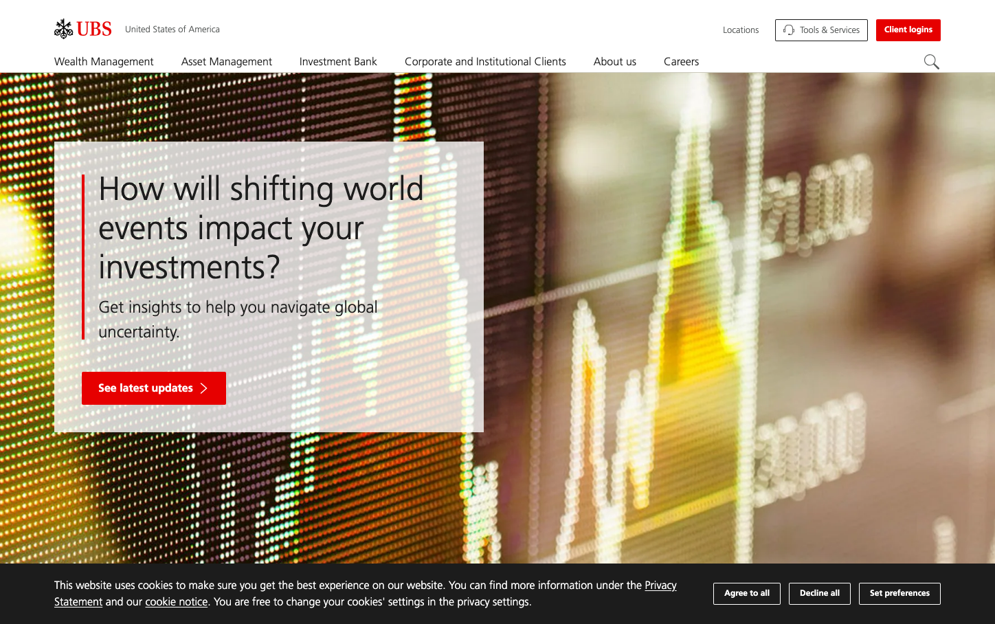 UBS projects Swiss precision through high-contrast financial data visualization and strategic use of pure red as an accent. The brand balances institutional gravitas with dynamic market energy through abstract digital displays and clean typography hierarchy.