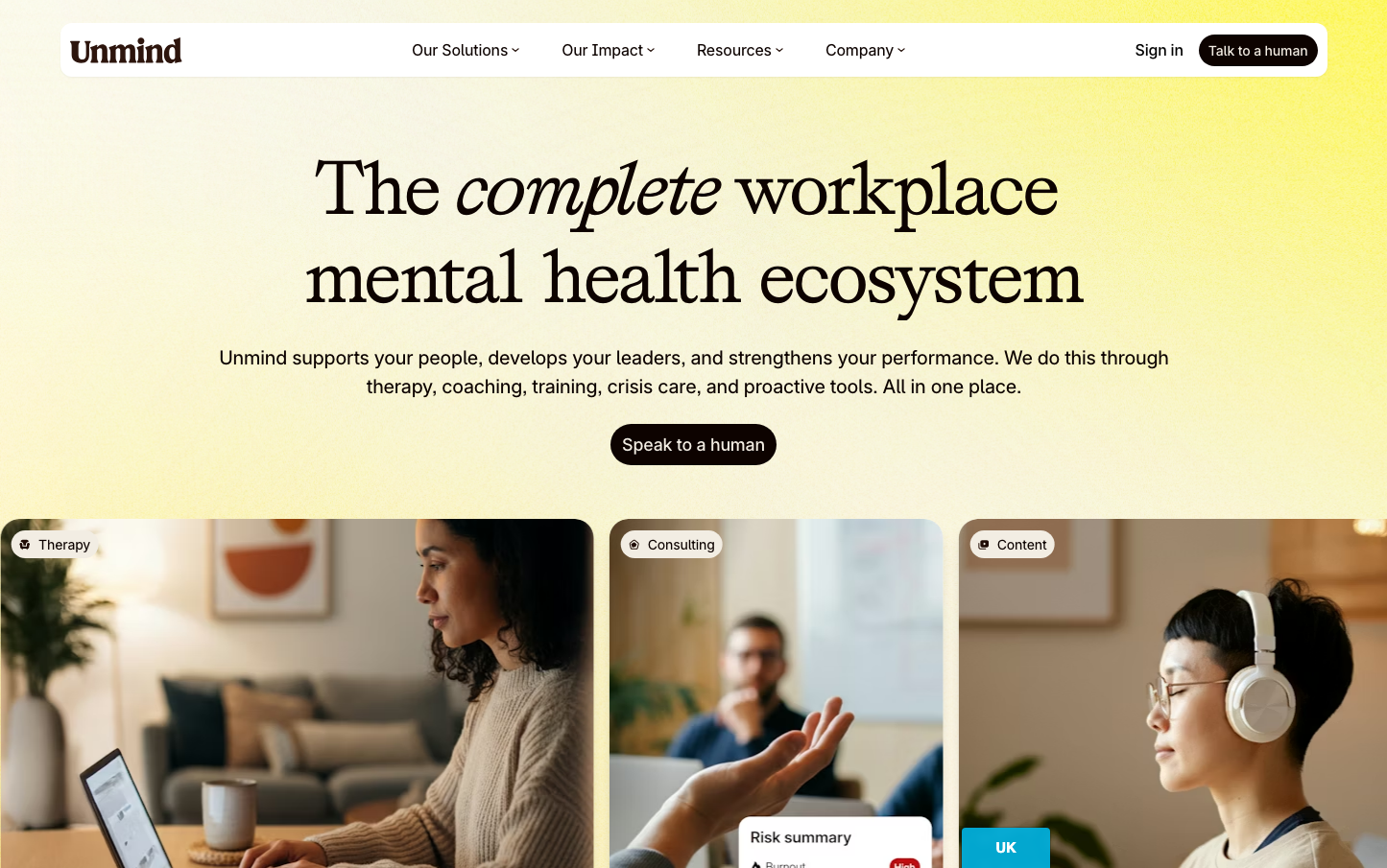 Unmind embraces a warm, optimistic aesthetic with a sophisticated cream-to-yellow gradient backdrop that conveys hope and healing. The elegant serif headlines paired with clean Inter body text create a balance between emotional warmth and professional credibility, positioning mental health as both approachable and serious.
